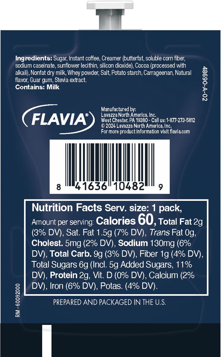 Sugar, Instant coffee, Creamer (butterfat, soluble corn fiber, sodium caseinate, sunflower lecithin, silicon dioxide), Cocoa (processed with alkali), Nonfat Dry Milk, Whey powder, Salt, Potato starch, Carrageenan, Natural Flavor, Guar gum, Stevia extract. Contains: Milk.